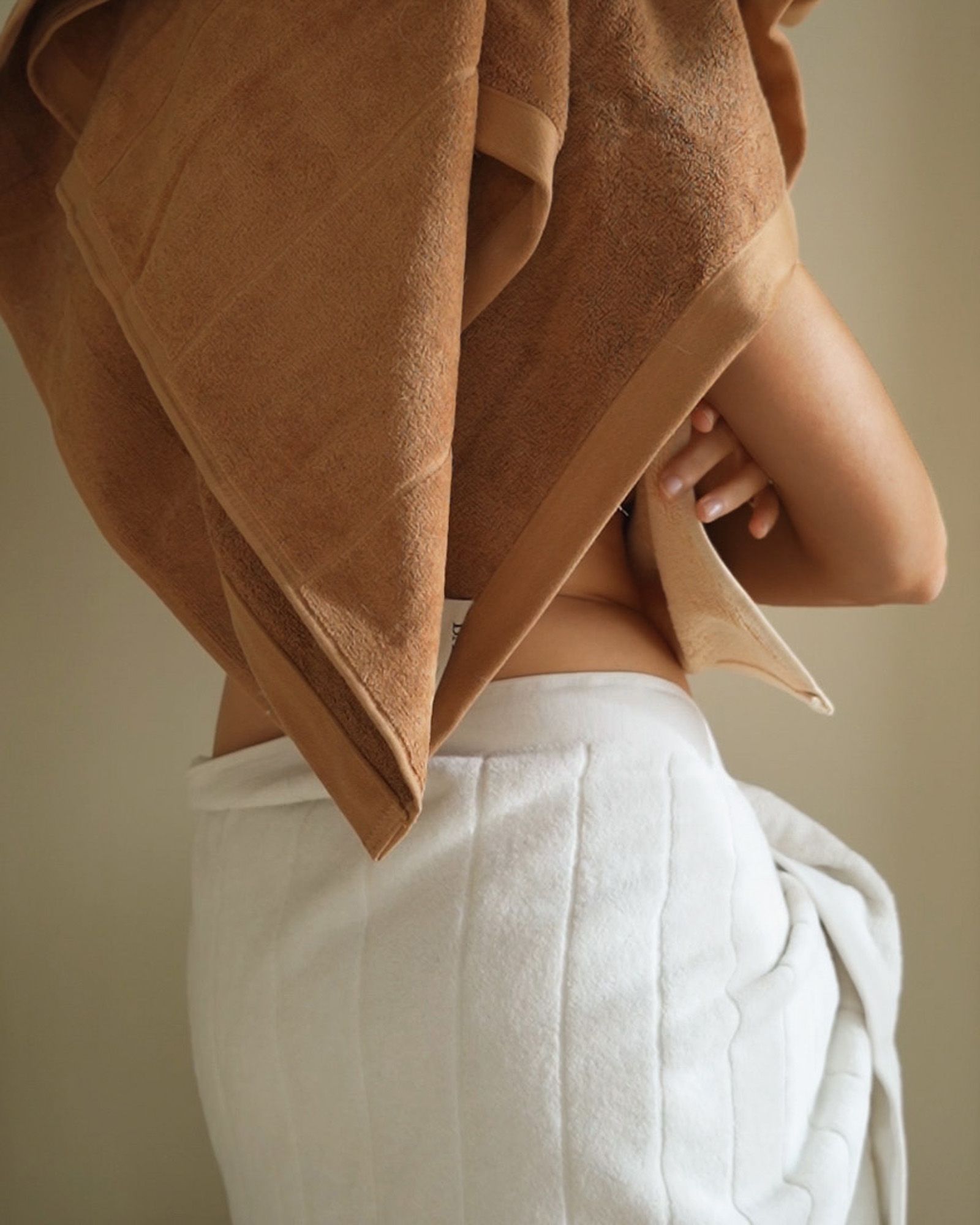 ABOVE: Mel bathes with the Madre Bath Sheet in Rust & Grande Bath Towel in Stone.